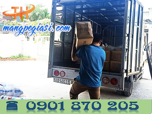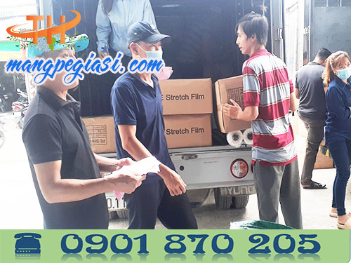 Nhân viên giao hàng bốc xếp màng pe lên xe